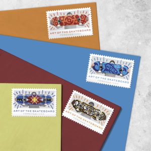 The bold artwork emblazoned on a skateboard deck is often as eye-catching and individualistic as a skater’s most breathtaking moves. These four stamps celebrate the Art of the Skateboard with vibrant designs that capture skateboarding’s excitement and reflect the diversity and influences of the four artists whose work is featured.