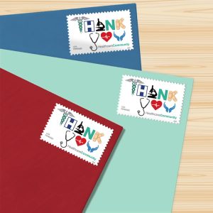 Recognize the healthcare community and its dedication to our well-being with the stamp from the U.S. Postal Service.The stamp artwork consists of health-related icons that spell out the stacked words “THANK YOU” followed by the words “Healthcare Community,” all against a pristine white background.